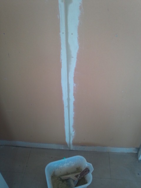 石膏ボードの目地にパテを塗る。