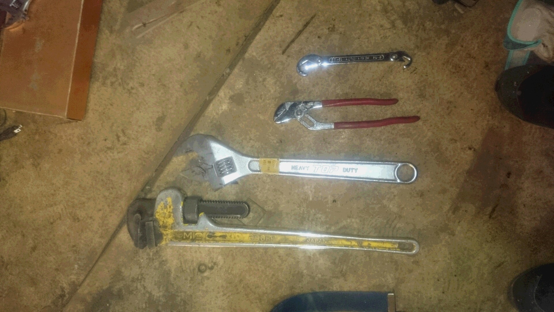 一番下のでっかいパイプレンチは昨日多摩っ子さんから借りてきた。