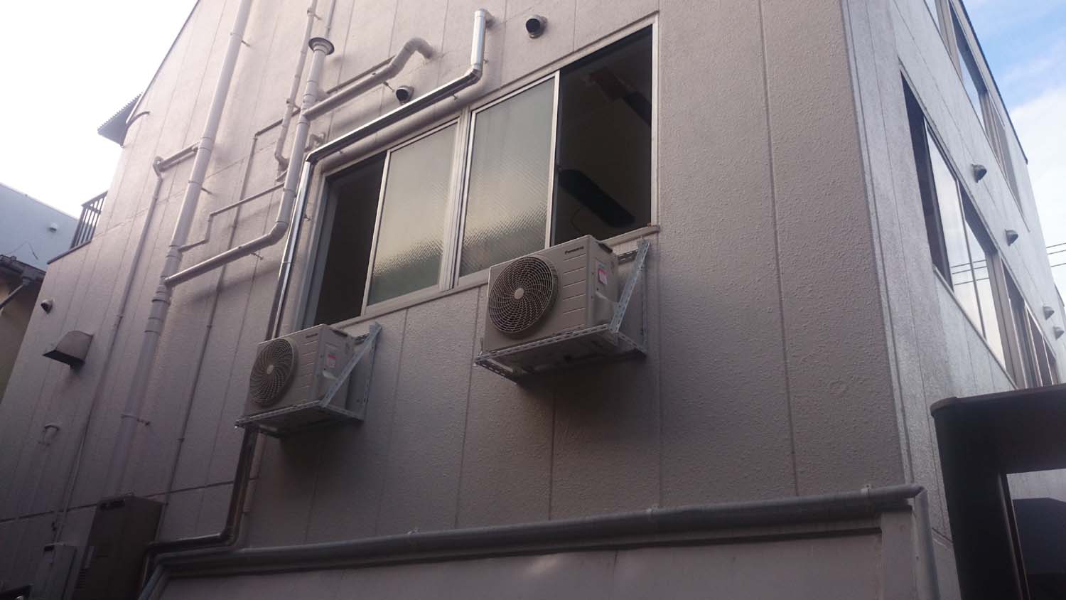 午後からは、エアコンの室外機を外壁に取り付けた。