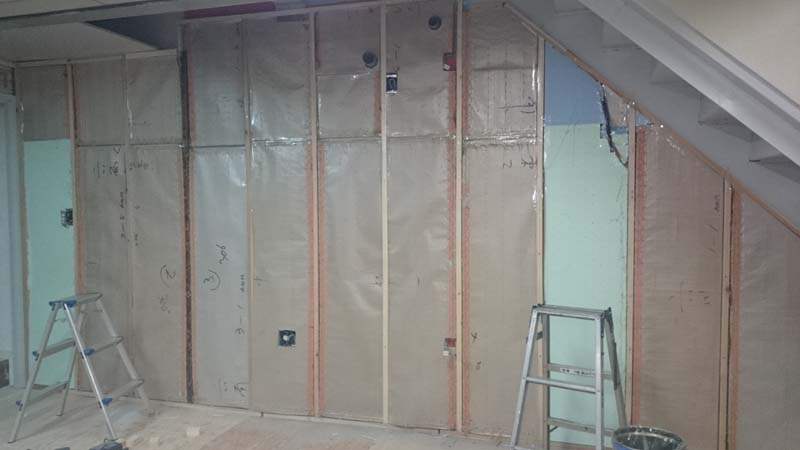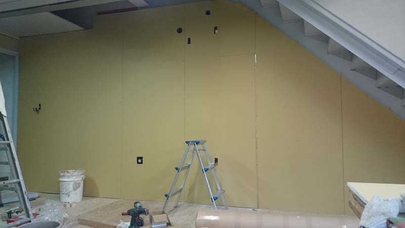 昨日断熱材を入れたブロックの壁に石膏ボードを張った。