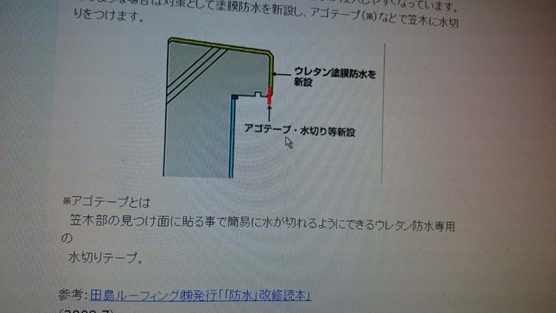 笠木にアゴテープ(水切りテープ)を貼ってからウレタン防水塗料を塗るべきだそうな。。
