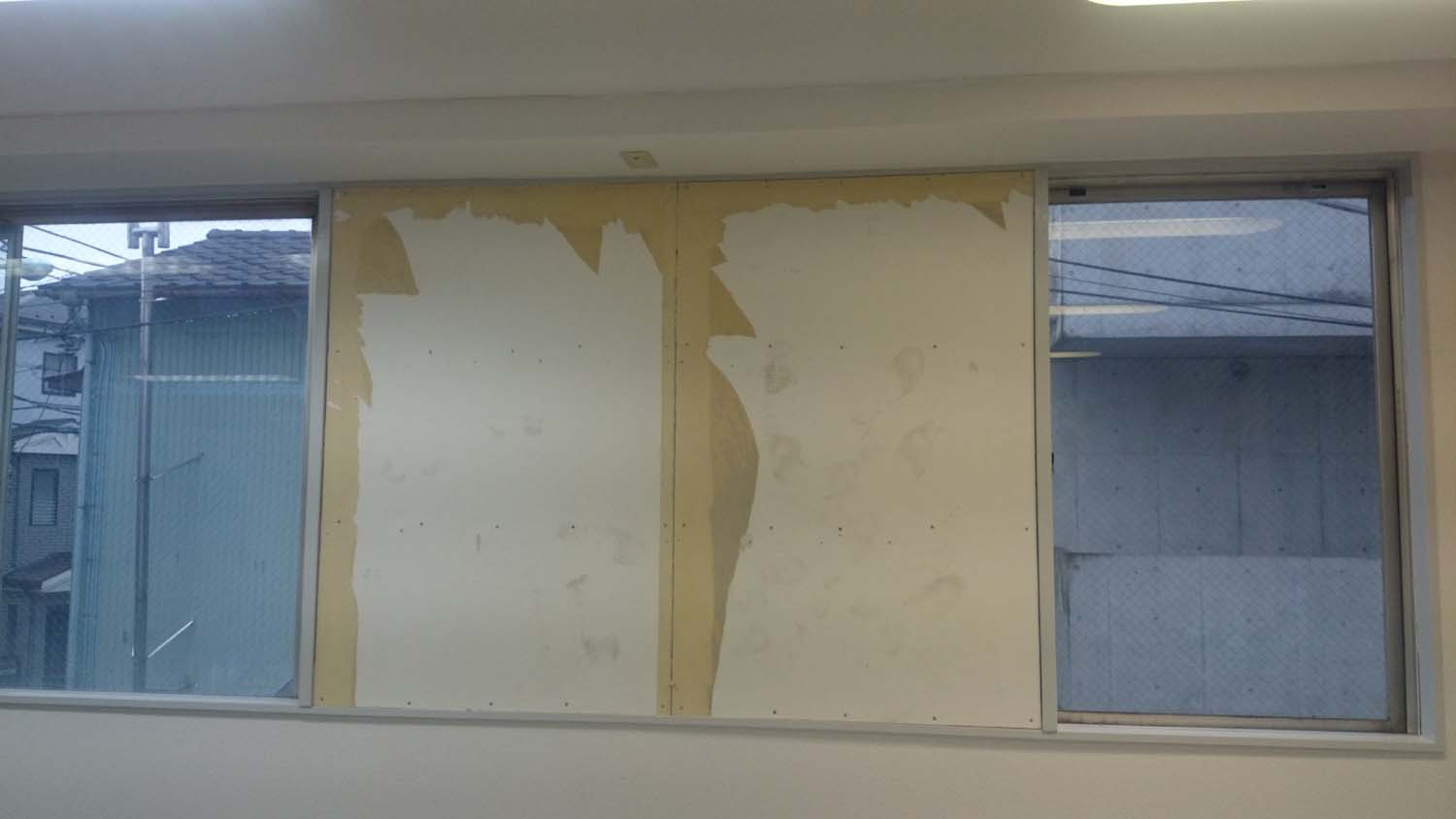 窓を塞ぐために下地を入れたところに石膏ボードを張った。